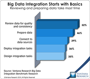 Other organizations are still examining how to automate integration tasks. The most common barriers to improving big data integration are cost of the software or license (for 44%), lack of resources to use on improvement (37%) and the sense that big data technologies are too complicated to integrate (35%). These findings demonstrate that many organizations need to better understand the efficiency and cost savings that can be realized by using purpose-built technology instead of manual approaches using tools not designed for big data. Along with identifying solid business benefits, establishing savings of time and money are essential pieces of a convincing rationale for investment in big data integration technology. The most time spent in big data integration today is on basic tasks: reviewing data for quality and consistency (52%), preparing data for integration (46%) and connecting to data sources for integration (39%). The first two are related to ensuring that data is ready to load into big data environments. Data preparation is a key part of big data and overall information optimization. More vendors are developing dedicated technology to help with it.
